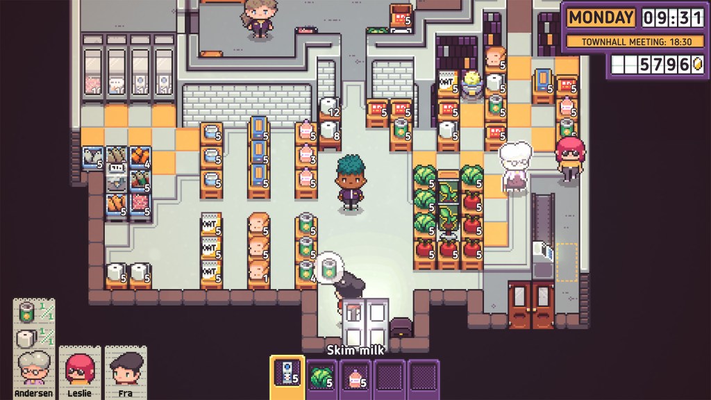 Um meinen Job noch ein bisschen spannender zu gestalten, bekomme ich tägliche und wöchentliche Quests von der Spitze des Franchise zugetragen. Die lauten dann beispielsweise „Verkaufe zehn Äpfel“ oder „Schließe zehn Verkäufe ab“. Mit den dadurch verdienten Punkten kann ich mir Verbesserungen anschaffen, erweitere etwa mein Sortiment. Neue Einrichtungsgegenstände beschaffe ich derweil beim Handwerksshop, bei dessen Besuch ich auch gleich einen Abstecher an der Müllhalde machen kann, um mich für das Recycling von Verpackungsmaterial auszahlen zu lassen.