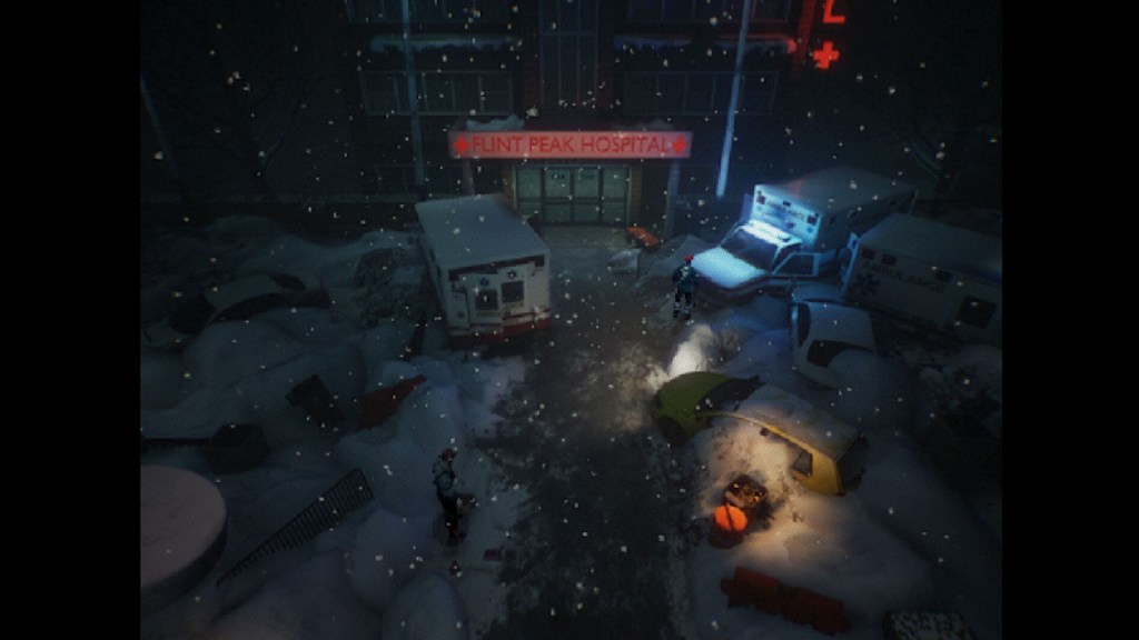 Als Guy marschiere ich also während der letzten Sekunden hinaus aus dem Krankenhaus, hinein ins Städtchen Flint Peak. Die Wege sind gepflastert von Zombies. Überall liegen geschrottete Fahrzeuge. Die schreiende Stille ringsherum wird unerträglich – während die (natürlich feste) Kamera immer weiter hinausfliegt. Irgendwann blicke ich auf Guy aus der Vogelperspektive – und erkenne: Das Krankenhaus war erst der Anfang dieses Abenteuers.