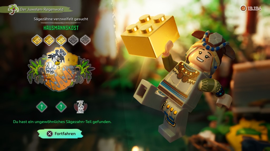 Außerdem habe ich eine Übersichtskarte vom Dorf vermisst oder zumindest ein Menü, das meinen Fortschritt mitverfolgt. Wieviel von Mutterherz habe ich bereits aufgebaut und wo warten noch Gebäude auf mich? Welche Werkzeuge und seltene Waffen habe ich bereits genutzt und welche Maschinen streifen durch die Wildnis? Und wie viele goldene Steine gibt es noch in welchem Gebiet zu sammeln?